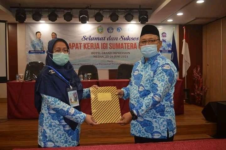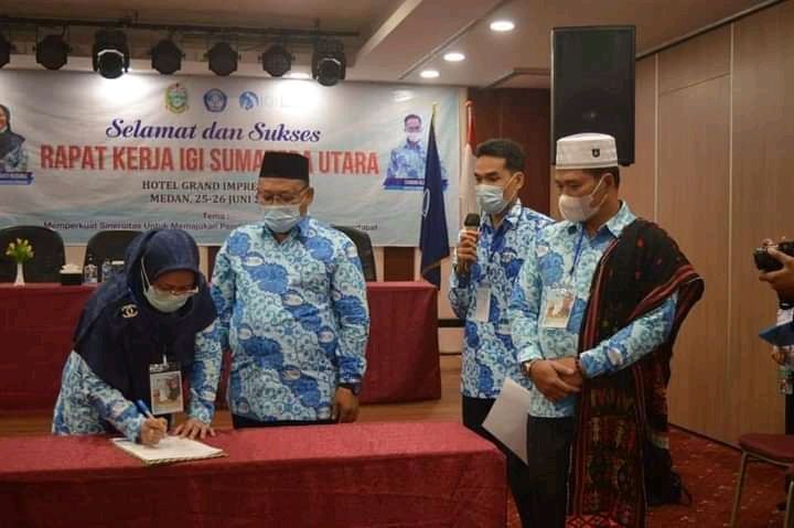 Sumatra Utara, IGI.OR.ID- Rapat Kerja Ikatan Guru Indonesia (IGI) Wilayah Sumatra Utara dilaksanakan pada tanggal 25 Juni 2021 di Hotel Grand Impression Medan. Sebelum dilaksanakan Rapat Kerja acara dimulai dengan ceremonial berupa tari persembahan, menyanyikan Lagu Indonesia Raya, Mars IGI dan Hymne IGI. Dilanjutkan dengan laporan Ketua Panitia oleh Samiun Alim (Ketua IGI Medan). Lalu pelaksanaan Prosesi Pelantikan Pengurus IGI Wilayah Sumut oleh Moel Harahap ( Waketum I IGI Pusat). Adapun susunan Pengurus Wilayah IGI Sumatra Utara terdiri dari :